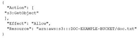 A developer is creating an application for a company. The application needs to read the file doc.txt that is placed in the folder of an Amazon S3 bucket that is named DOC-EXAMPLE-BUCKET. The company's security team requires the principle of least privilege to be applied to the application's IAM policy.