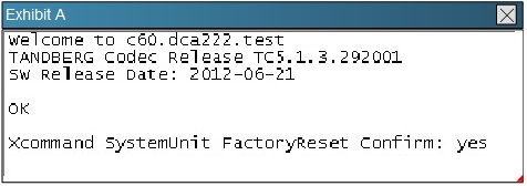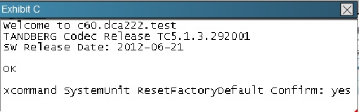 Reference:http://www.cisco.com/c/dam/en/us/td/docs/telepresence/endpoint/profile-series/tc7/administration-guide/profile-c60-c40-and-codec-c60-c40- administrator-guide-tc70.pdfExp: System recovery: Factory reset If there is a severe problem with the video system, the last resort may be to reset it to its default factory settings. Always consider reverting to the previously used software image before performing a factory reset. In many situations this will recover the system*.A factory reset should only be performed by a system administrator or in contact with Cisco technical support. When factory resetting the video system the following happens:The call logs will be deleted.Passwords will be reset to default.All system parameters will be reset to default values.All files that have been uploaded to the system will be deleted. This includes, but is not limited to, custom backgrounds, certificates, and the favorites list (My contacts).The previous (inactive) software image will be deleted.Release keys and option keys will not be affected. The system restarts automatically after the reset. It is using the same software image as before. We strongly recommend that you backup your systems log files and configuration before you perform a factory reset.