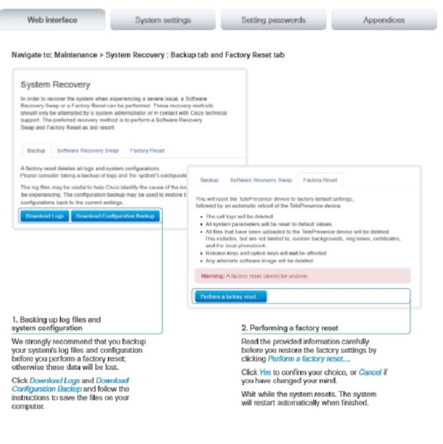 A factory reset should only be performed by a system administrator or in contact with Cisco technical support. When factory resetting the video system the following happens: