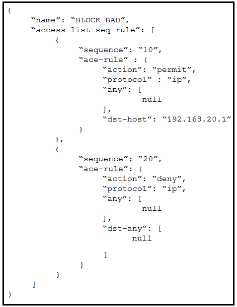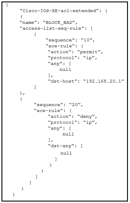 An engineer wants to replace the BLOCK_BAD ACL on the Cisco IOS XE router with this new content. The engineer wants to use RESTCONF for this and constructs a PUT request to the resource/restconf/data/native/ip/access-list/Cisco-IOS-XE-acl:extended=BLOCK_BAD. What must the body look like to achieve the Cisco IOS XE configuration?