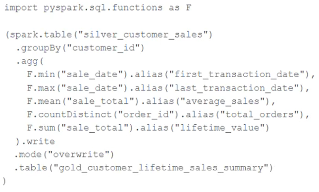 3. The gold_customer_lifetime_sales_summary table will be overwritten by aggregated values calculated from all records in the silver_customer_sales table as a batch job.