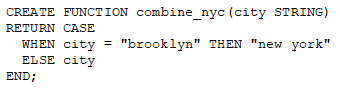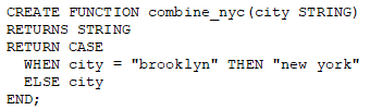 A data engineer needs to apply custom logic to string column city in table stores for a specific use case. In order to apply this custom logic at scale, the data engineer wants to create a SQL user-defined function (UDF).