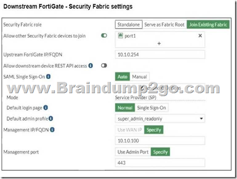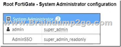 From the Root FortiGate – System Administrator Configuration exhibit:The AdminSSO account has the super_admin_readonly role.From the Downstream FortiGate – Security Fabric Settings exhibit:The Security Fabric role is set to Join Existing Fabric, meaning it will authenticate with the root FortiGate.SAML Single Sign-On (SSO) is enabled, and the default admin profile is set to super_admin_readonly.When the AdminSSO user logs into the downstream FortiGate using SSO, the authentication request is sent to the root FortiGate, where AdminSSO has super_admin_readonly permissions. Since the downstream FortiGate inherits this permission through the Security Fabric configuration, the user will be granted super_admin_readonly access.