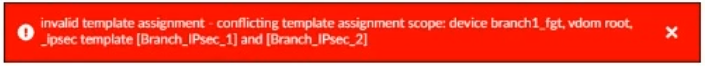 Each template defines a VPN tunnel. When the administrator tried to assign the second template to the FortiGate device, the FortiManager displayed the below error message: