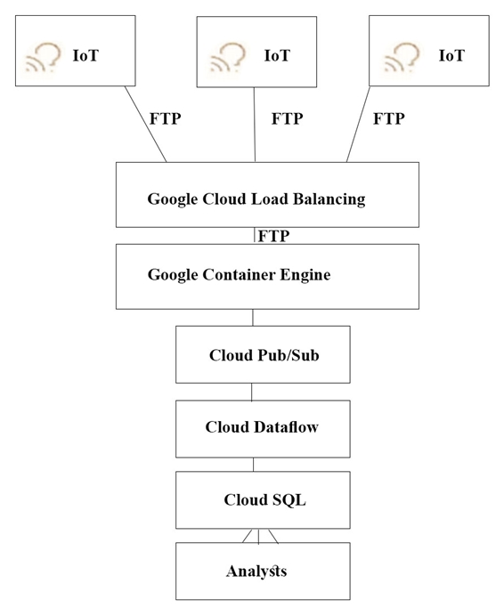 The push endpoint can be a load balancer.A container cluster can be used.Cloud Pub/Sub for Stream Analytics Reference:https://cloud.google.com/pubsub/https://cloud.google.com/solutions/iot/https://cloud.google.com/solutions/designing-connected-vehicle-platform https://cloud.google.com/solutions/designing-connected-vehicle-platform#data_ingestion http://www.eweek.com/big-data-and-analytics/google-touts-value-of-cloud-iot-core-for-analyzing-connected-car-data https://cloud.google.com/solutions/iot/