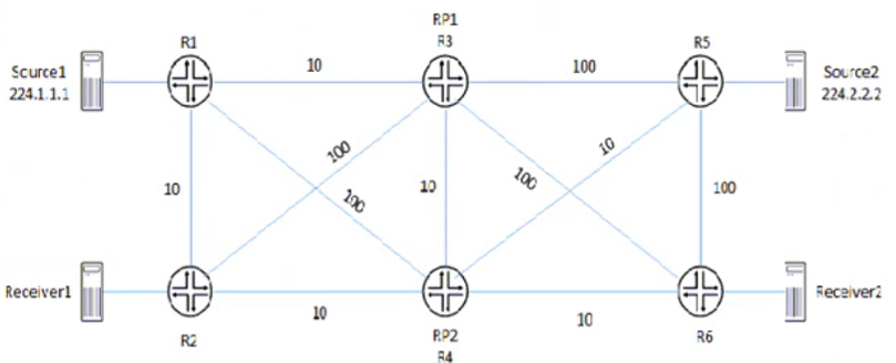 Referring to the exhibit. PIM-SM is configured on all routers, and Anycast-RP with Anycast-PIM is used for the discovery mechanism on RP1 and RP2. The interface metric values are shown for the OSPF area.