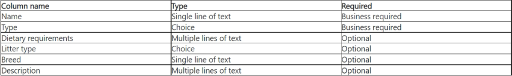 The Pet table has been added to the Sales Professional app sitemap. The table has the following columns, each created WITHOUT making any changes to the advanced options.