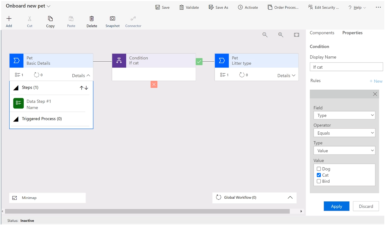 You are creating a business process flow named "Onboard new pet" to support onboarding of new clients for a pet care business.