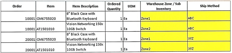 Your company has a warehouse that is classified as two different zones to enforce allocation and picking from only one subinventory at a time. The business has a contract with a specific outbound logistics carrier to deliver all orders for a particular customer zone or postal code.
